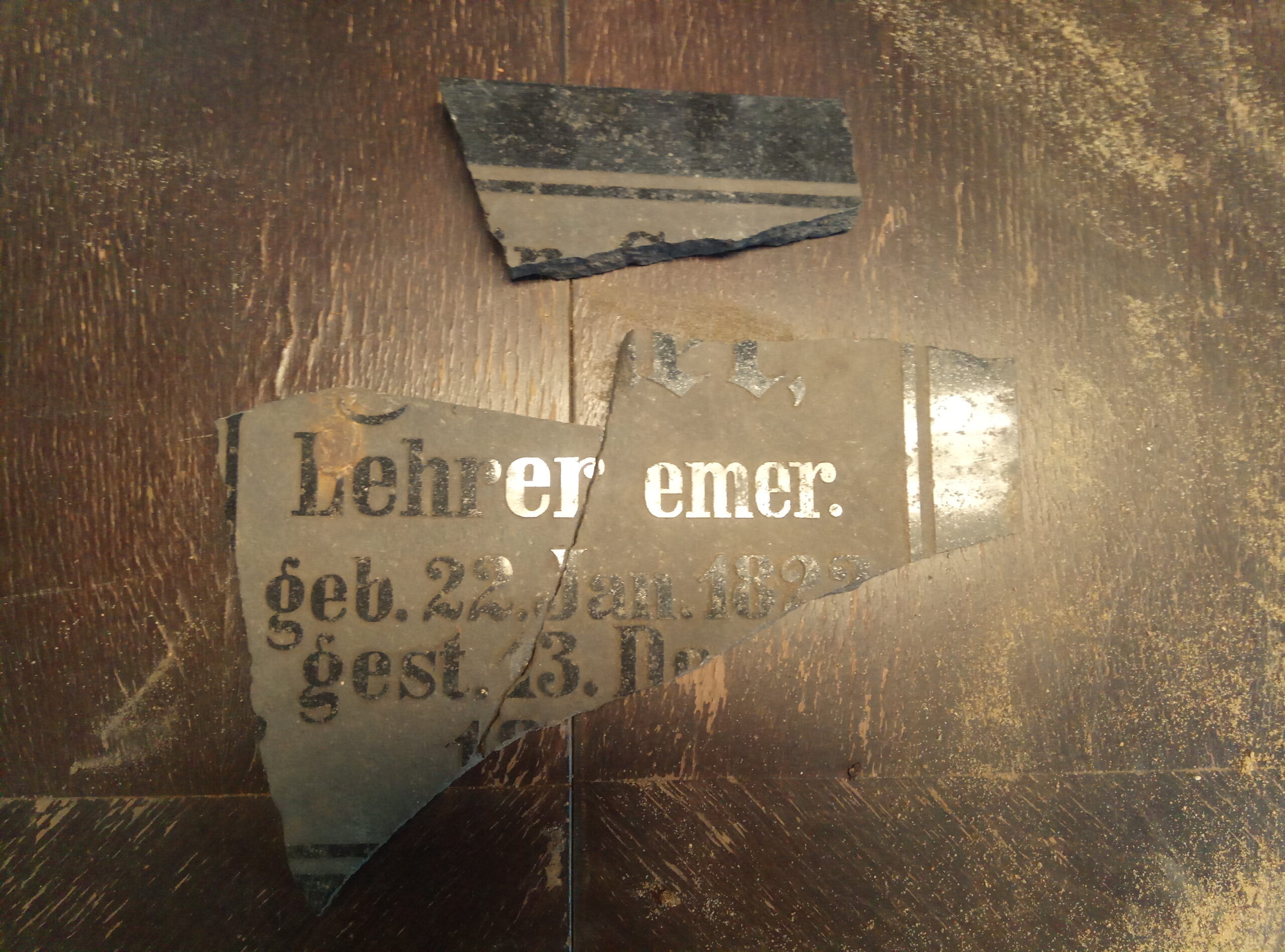 Fragmenty nagrobka odkrytego w parku św. Trójcy. Należał do emerytowanego nauczyciela, który urodził się w 1822 lub 1823 r.