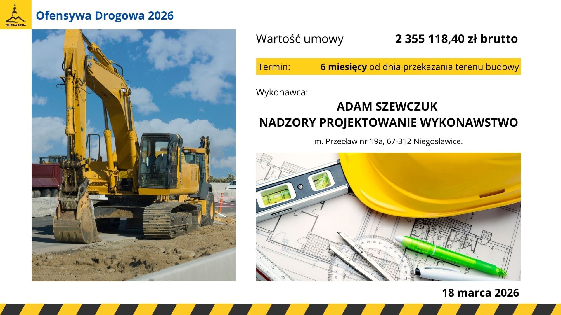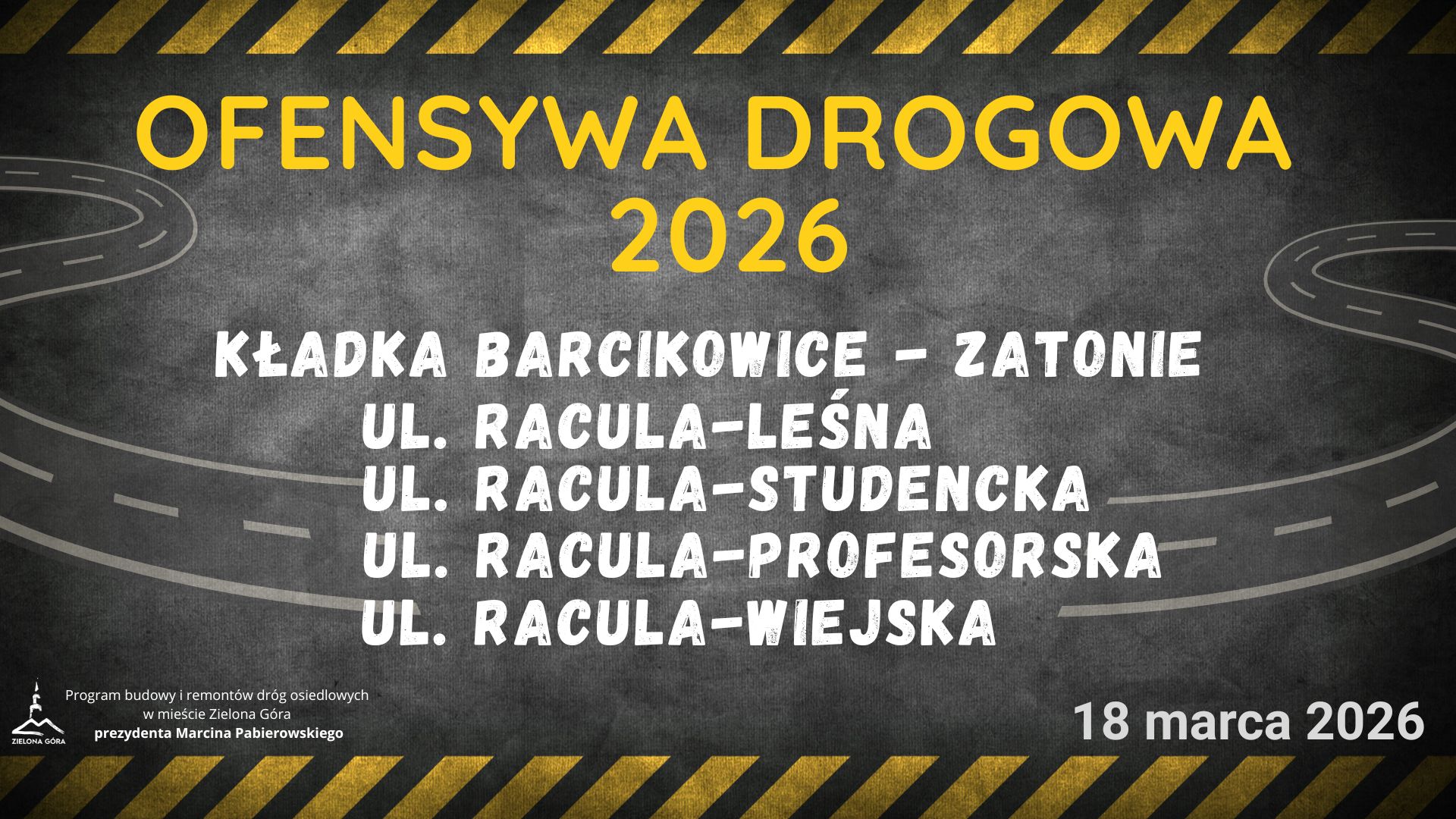 – Kontynuujemy Ofensywę Drogową 2026, w budżecie miasta zaplanowaliśmy remonty 30 dróg – mówił prezydent Marcin Pabierowski. I uzupełniał: – Budowa dróg osiedlowych, dojazdowych i wewnętrznych, to priorytet mojej prezydentury. Obiecałem to zielonogórzanom. Obecnie trwają duże inwestycje m.in. przebudowa ulic Zacisze i Waryńskiego, realizowane są obwodnica zachodnia i trasa aglomeracyjna.