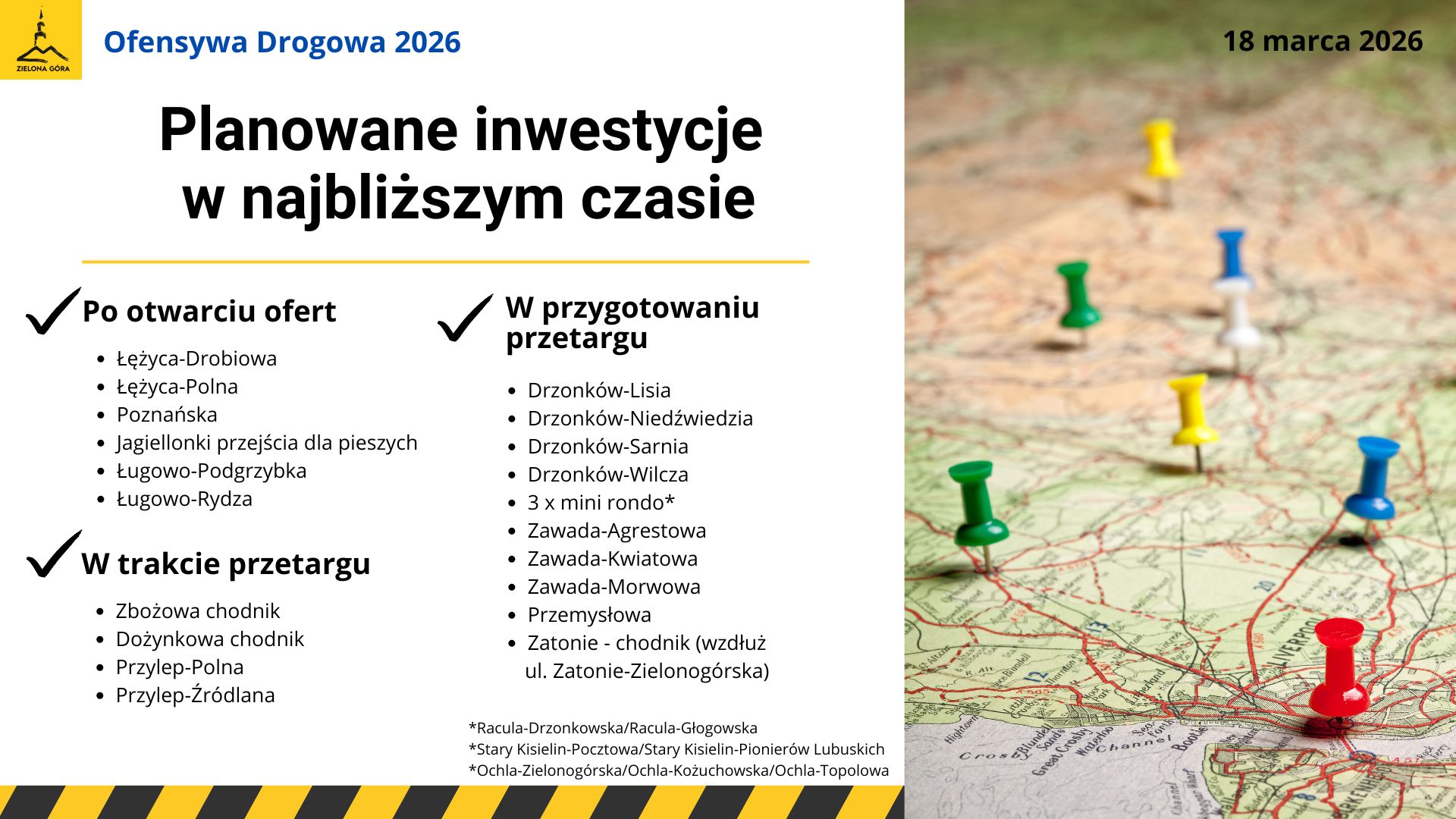 Plany remontowe na ten rok są bogate. Po otwarciu ofert w przetargu na realizację są ulice: Łężyca-Drobiowa, Łężyca-Polna, Poznańska na Chynowie, Jagiellonki (przejście dla pieszych), Ługowo-Podgrzybka i Ługowo-Rydza. W trakcie przetargu są kolejne inwestycje drogowe: ul. Zbożowa (chodnik), ul. Dożynkowa (chodnik), Przylep-Polna i Przylep-Źródlana. W przygotowaniu przetargu są ulice: Drzonków-Lisia, Drzonków-Niedźwiedzia, Drzonków-Sarnia, Drzonków-Wilcza, trzy mini ronda: Zawada-Agrestowa, Zawada-Kwiatowa i Zawada-Morwowa oraz ul. Przemysłowa i Zatonie – chodnik (wzdłuż ul. Zatonie-Zielonogórska).