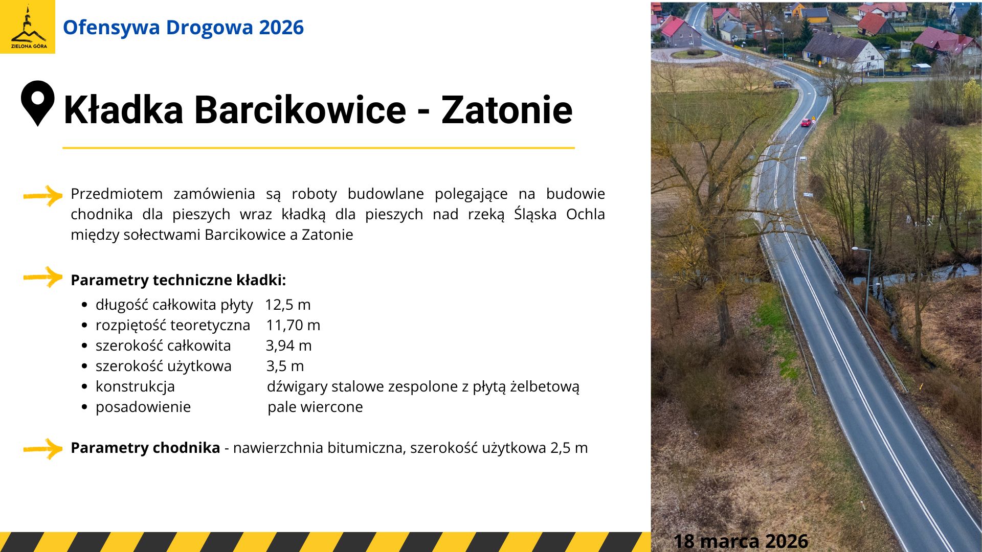 – Kładka Barcikowice-Zatonie poprawi komunikację między dwoma zielonogórskimi sołectwami, w planach jest budowa chodnika dla pieszych wraz z kładką dla pieszych nad rzeczką Śląska Ochla o rozpiętości ponad 12 metrów. Inwestujemy w bezpieczeństwo i komfort mieszkańców, to długo oczekiwana inwestycja – dopowiedział prezydent.
