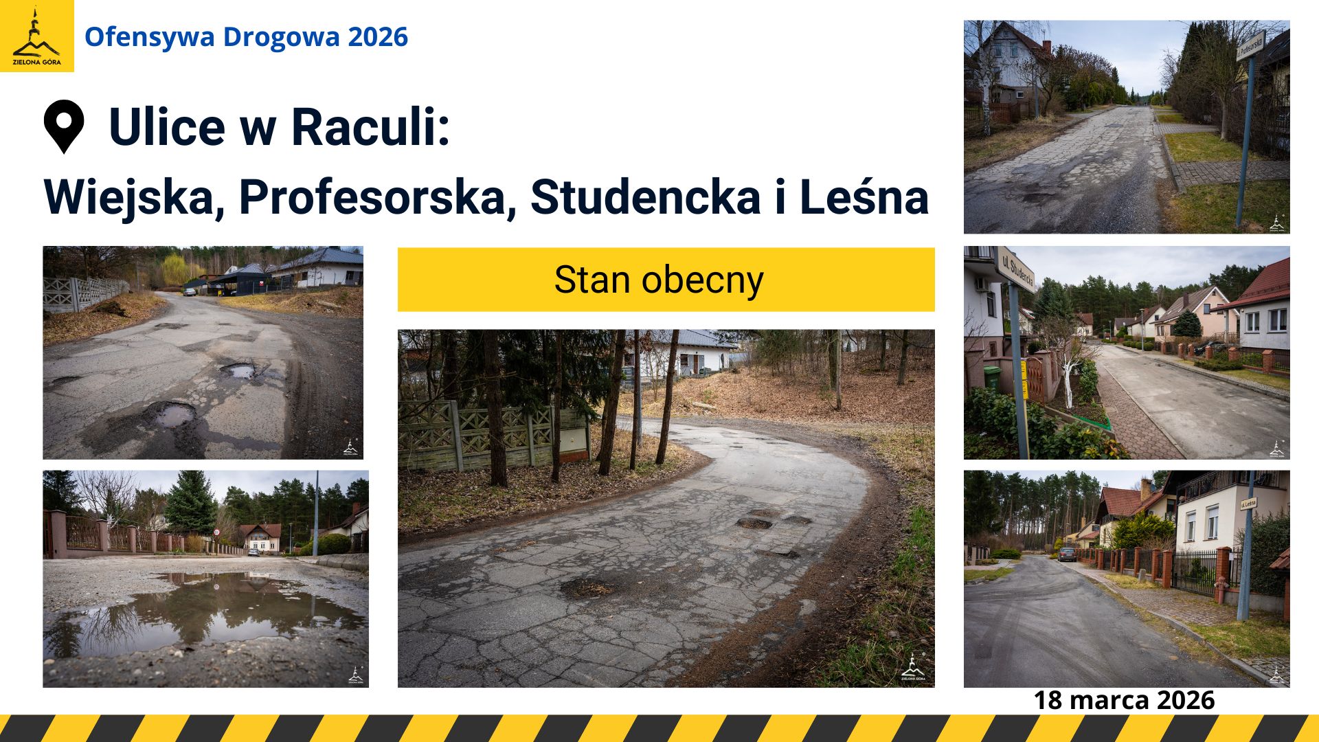 Ulice Leśna, Studencka, Profesorska i Wiejska o łącznej długości blisko 900 metrów obecnie są w fatalnym stanie technicznym. Nawierzchnia jezdni jest pełna dziur, a mieszkańcy mają spore problemy z dojazdem do swoich posesji.