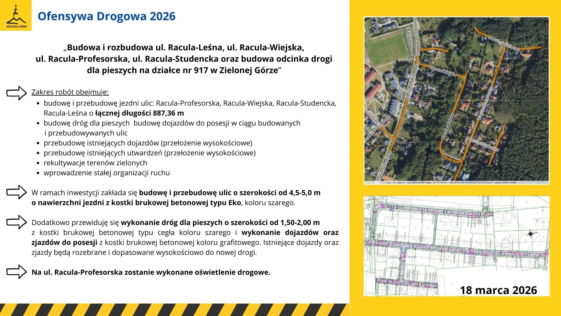 W planach jest m.in. budowa dróg dla pieszych i dojazdów do posesji, przebudowa istniejących dojazdów i utwardzeń. Uliczki zyskają nawierzchnię z kostki betonowej (szarej) typu eko. Na ul. Racula-Profesorska przewidziane jest oświetlenie drogowe.