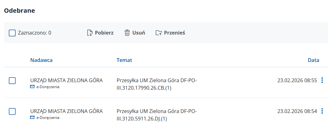1. Po zalogowaniu się do e- doręczeń w skrzynce widać decyzje w wiadomościach odebranych: