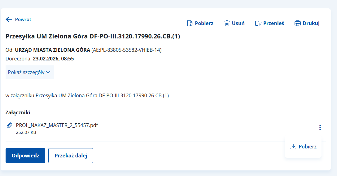 2. Aby pobrać treść decyzji, należy wejść w szczegóły wiadomości