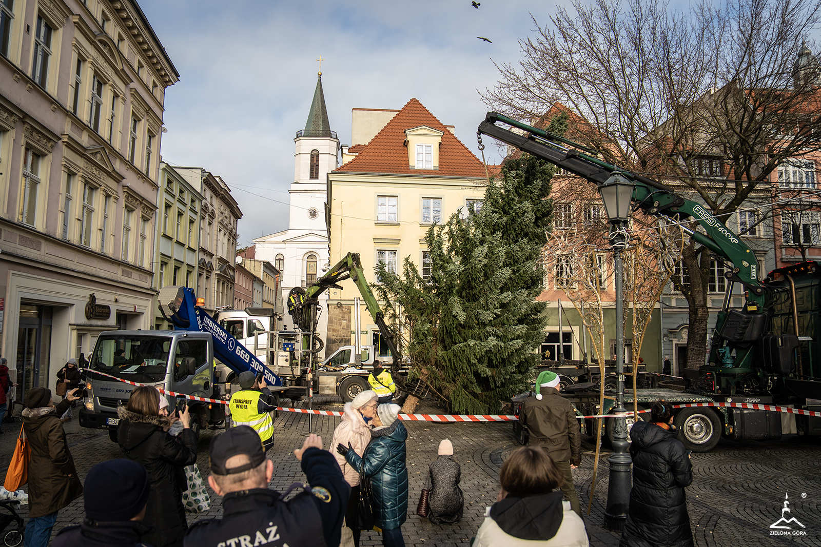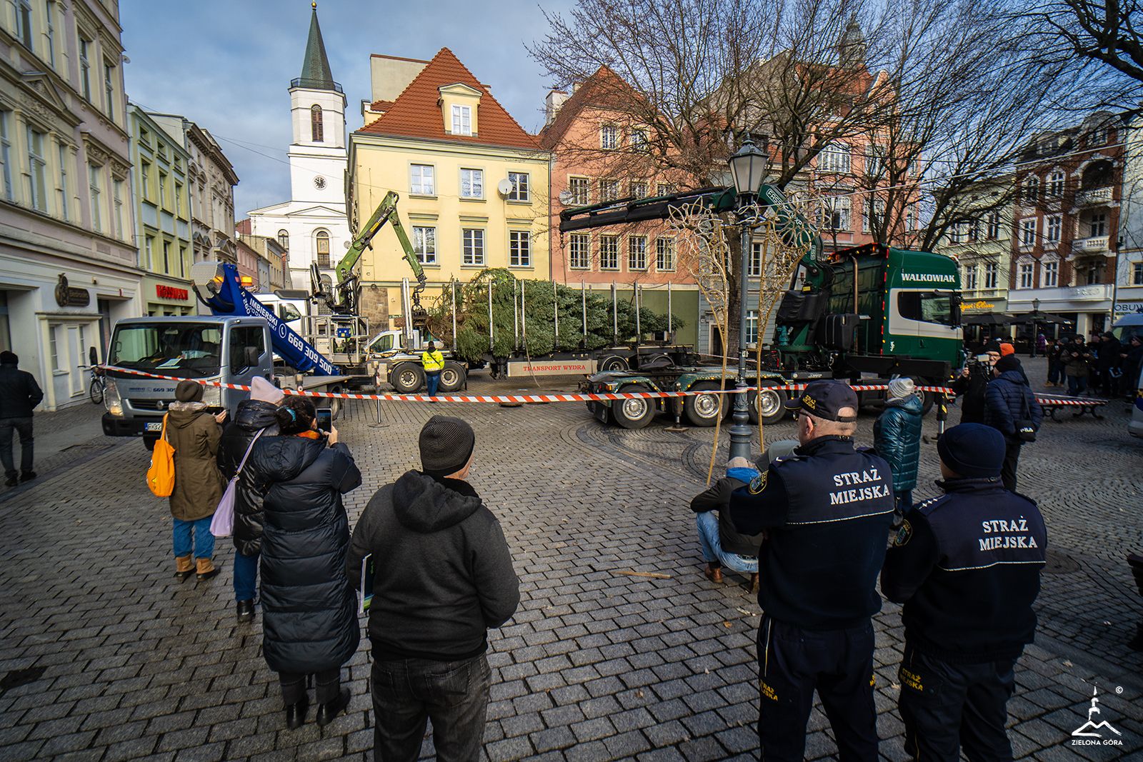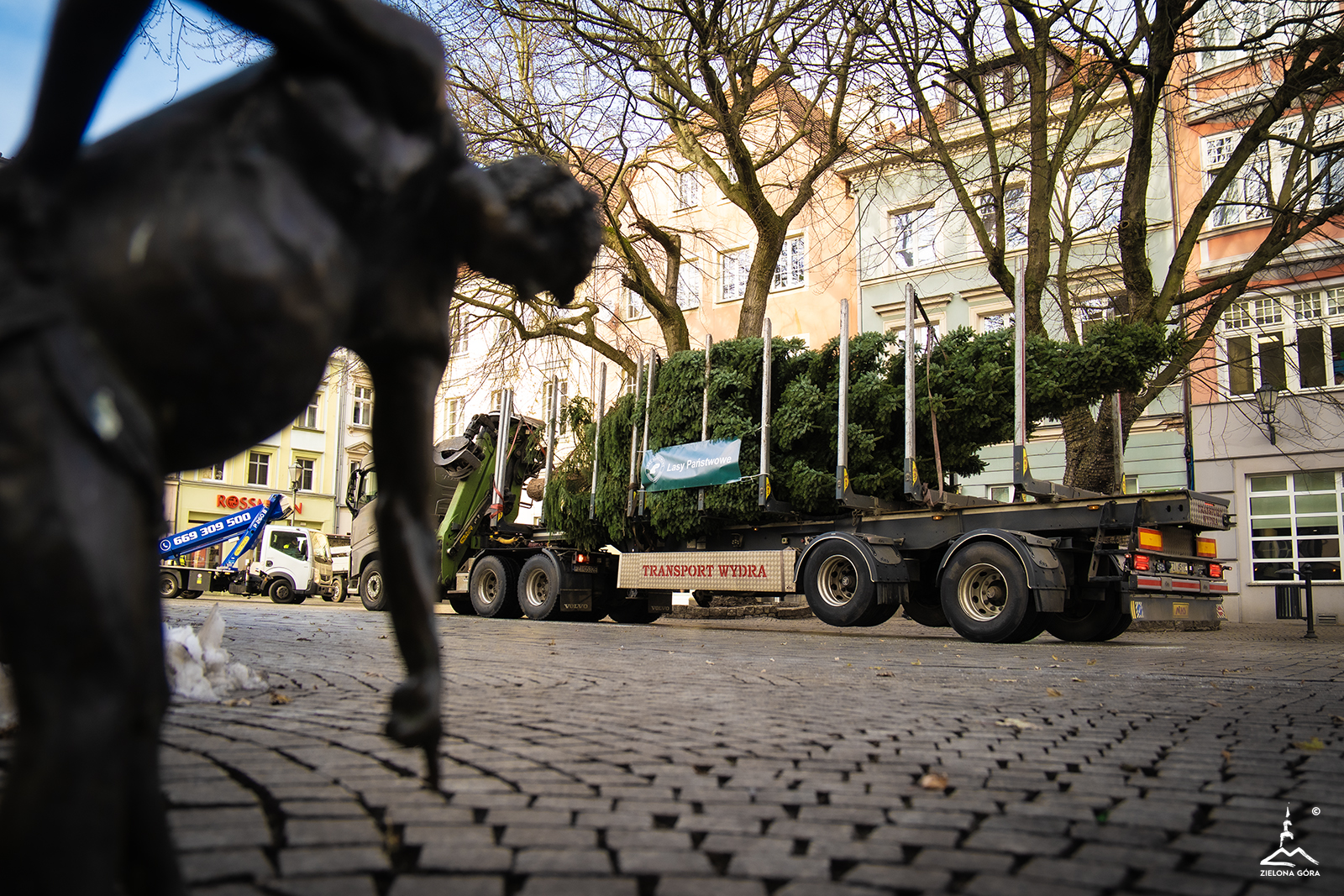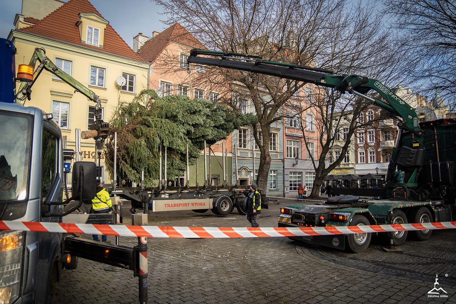 Świerk został przywieziony z Babimostu przy eskorcie policji i straży leśnej. Transport choinki to wymagające zadanie. – Przyjechała na samochodzie z dźwigiem, specjalnie przystosowanym do przewozu drewna – wyjaśnia Bartłomiej Magdziarz, rzecznik prasowy Nadleśnictwa Zielona Góra.