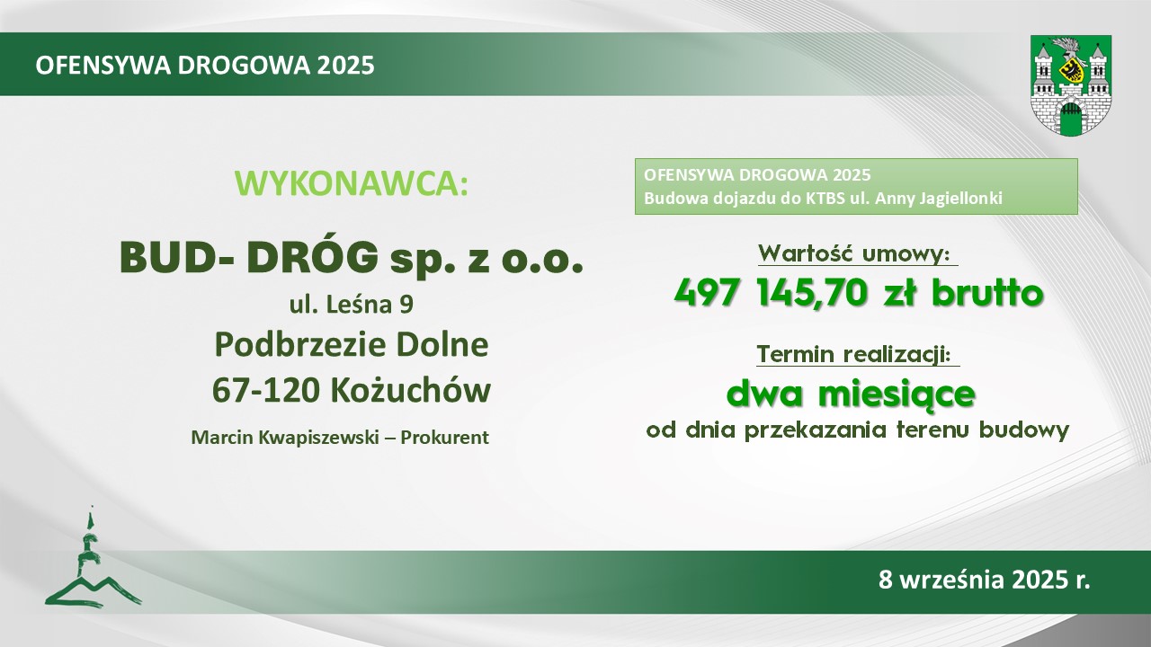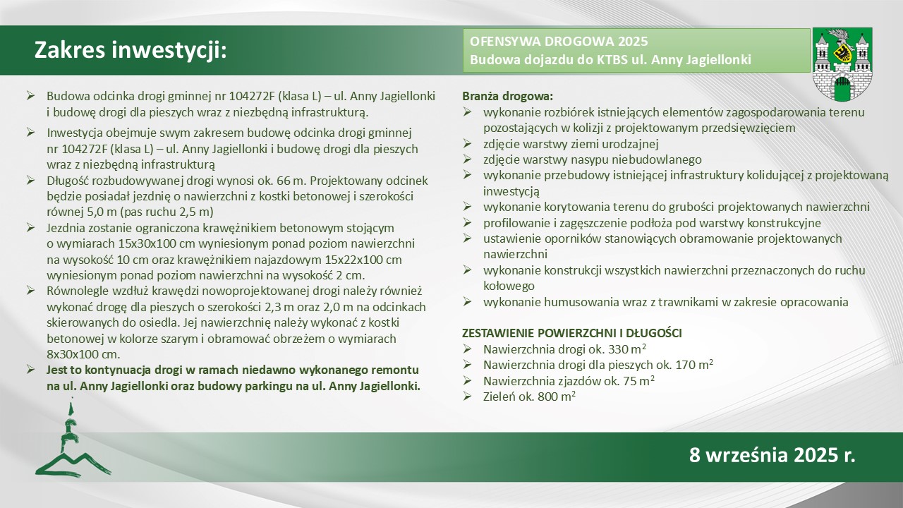 Dojazdem do nowych bloków KTBS przy Anny Jagiellonki zajmie się firma Bud-Dróg z Kożuchowa. – Przy ul. Anny Jagiellonki, inwestycja na głównym układzie komunikacyjnym niedawno się zakończyła, teraz wykonawca wybuduje brakujący fragment drogi. Dzięki temu mieszkańcy bloków będą mieli dobry dojazd – wyjaśnia Paweł Tonder.