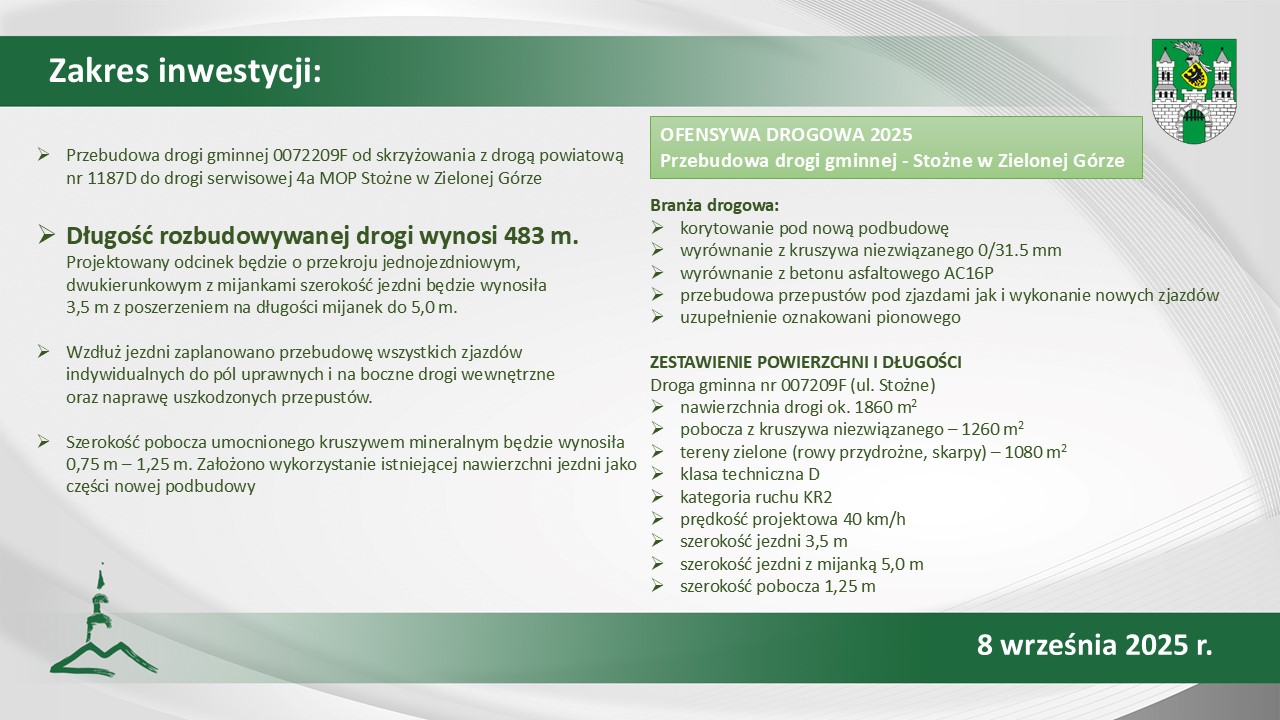 Wzdłuż jedni zaplanowano przebudowę wszystkich zjazdów indywidualnych do pól uprawnych i na boczne drogi wewnętrzne oraz naprawę uszkodzonych przepustów. Jak podkreślił P. Tonder nowa droga ma też znaczenie dla autobusów MZK, które za sprawą linii nr 21 od 1 września docierają do przysiółka Stożne. Pojazdy nie będą się niszczyć na nowej nawierzchni ulicy.