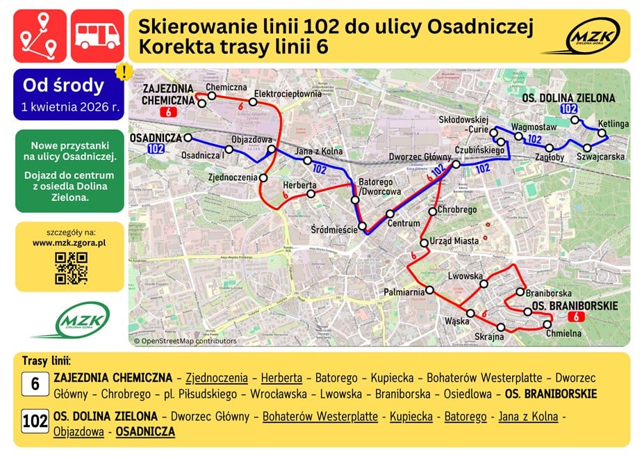 Obsługę Szpitala zapewnią minibusy linii 101 (w miejsce linii 102), których wybrane kursy będą realizowane przez ul. Zyty (Szpital) w obu kierunkach, co umożliwi wygodny dojazd i powrót ze Szpitala. Linia nr 102 przejmie część trasy dotychczas obsługiwanej przez linię nr 6, zapewniając bezpośrednie połączenie ze Śródmieściem, Centrum oraz Dworcem Głównym dla mieszkańców osiedla Dolina Zielona oraz ul. Osadniczej, Objazdowej i Jana z Kolna. Nie będzie już obsługiwała Szpitala Uniwersyteckiego. W celu poprawy dostępności komunikacji miejskiej dla mieszkańców ul. Osadniczej zostaną przy niej uruchomione nowe przystanki.