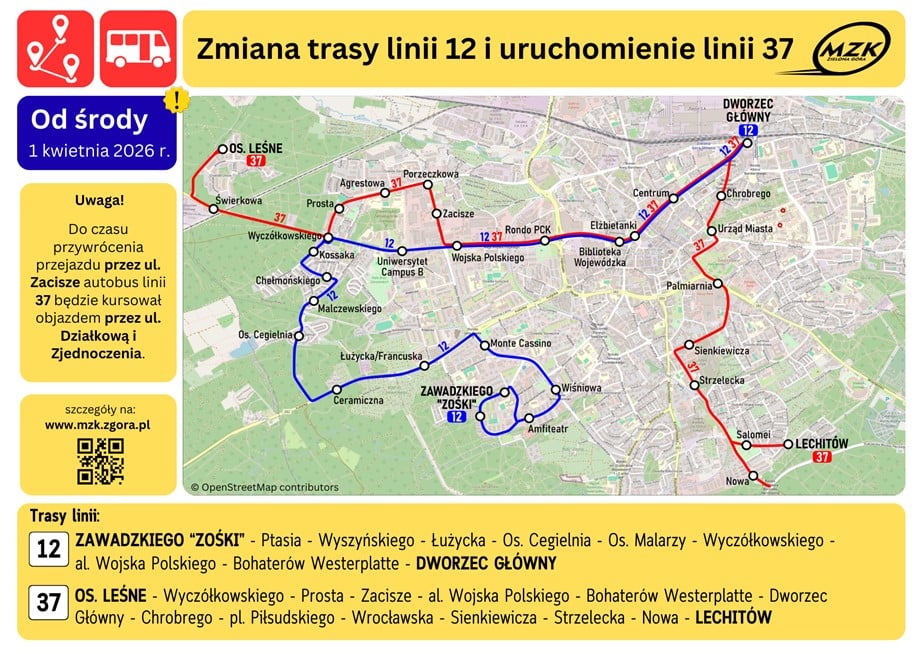 W związku z rozwojem zabudowy na osiedlu Leśny Dwór oraz wycofaniem linii 12 z osiedla Zacisze uruchomiona zostaje nowa linia nr 37. Autobus będzie kursował od poniedziałku do soboty na trasie: os. Leśne – ul. Lechitów. Do czasu zakończenia przebudowy ul. Zacisze obowiązywać będzie objazd przez ul. Działkową. Po zakończeniu prac autobusy linii 37 zostaną skierowane na docelową trasę przez ul. Zacisze i al. Wojska Polskiego.