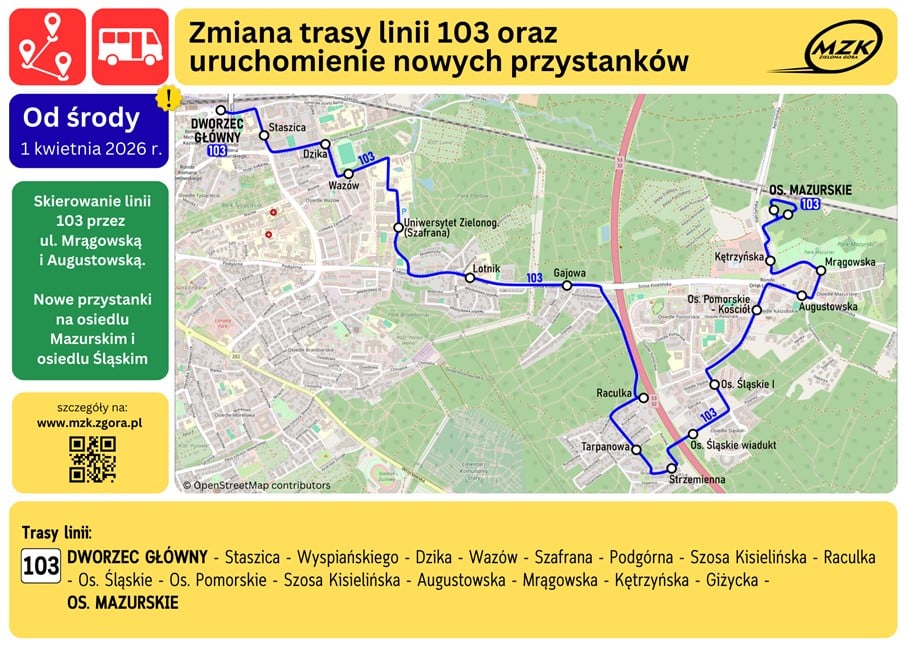 - linia nr 103 Minibus linii 103 będzie kursował na trasie Os. Mazurskie – Dworzec Główny z dodatkowym przejazdem przez ulicę Mrągowską i Augustowską, gdzie powstaną nowe przystanki. Na wniosek pasażerów wprowadzone zostaną także dodatkowe przystanki „Os. Śląskie wiadukt”, zlokalizowane pomiędzy przystankami Os. Śląskie I a Strzemienna. Przypominamy również, że od 1 kwietnia wznowione zostają kursy przez działki w Jędrzychowie na liniach nr 1 i 9 oraz wydłużona zostaje do godziny 16:19 praca minibusu linii 104 kursującego po terenie cmentarza przy ul. Wrocławskiej w soboty i niedziele.