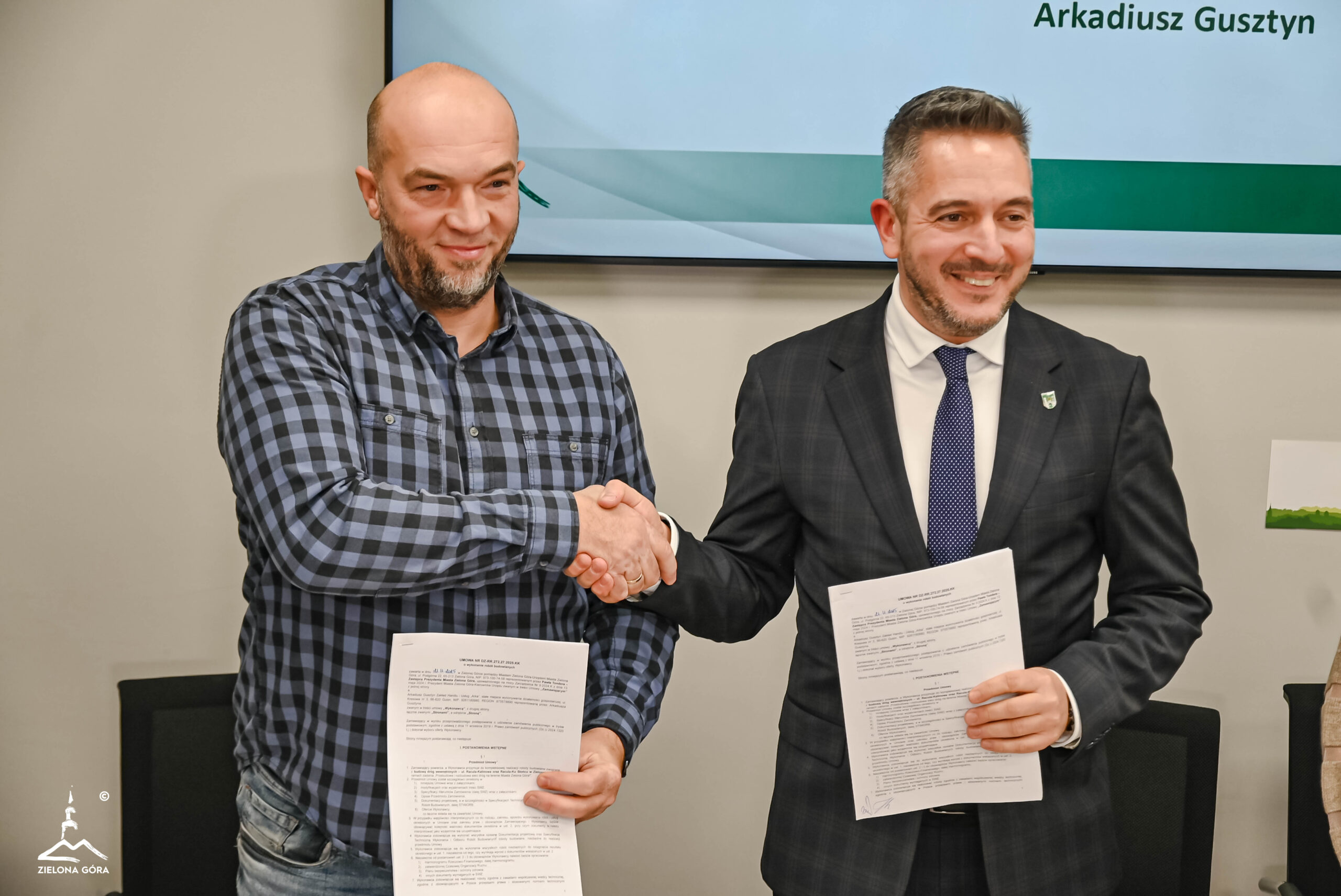 Fot. Władysław Czulak / Umowę na budowę dróg w Raculi podpisali Paweł Tonder, zastępca prezydenta miasta i Arkadiusz Gusztyn z Zakładu Handlu i Usług ARKA z Gubina.