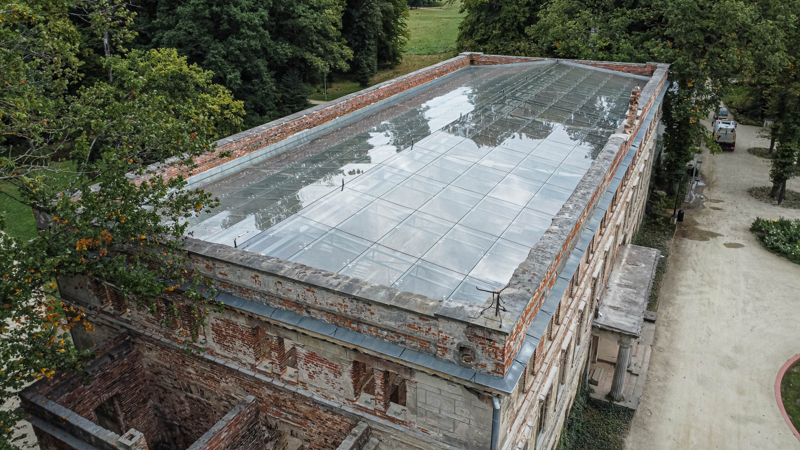 W miejscu, w którym dawniej był autentyczny dach pałacu, pojawiła się stalowa konstrukcja. Pokryły ją szklane tafle, każda ma sześć milimetrów grubości. Dach ukryty za attyką nie jest widoczny z zewnątrz. Nie zakłócił bryły budynku, bo możemy go obserwować tylko od wewnątrz. To nowoczesne rozwiązanie umożliwi lepsze wykorzystanie trwałej ruiny, w jaką zamienił się pałac przebudowany przez księżną Dorotę de Talleyrand, w XIX wieku, właścicielkę obiektu.