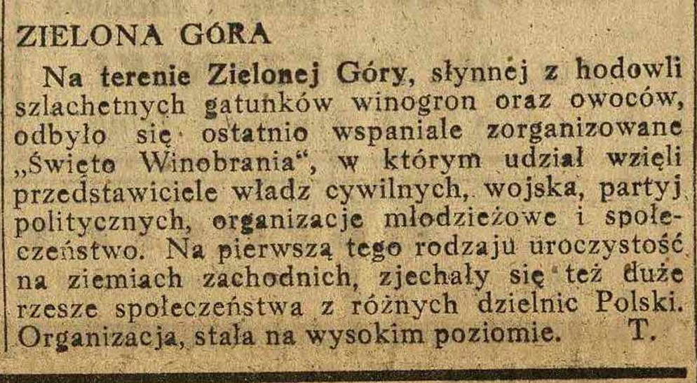 10 października 1945 r. „Głos Wielkopolski” relacjonował: – Na terenie Zielonej Góry, słynnej z hodowli szlachetnych gatunków winogron oraz owoców, odbyło się ostatnio wspaniale zorganizowane „Święto Winobrania”, w którym udział wzięli przedstawiciele władz cywilnych, wojska, partyj politycznych, organizacje młodzieżowe i społeczeństwo. Na pierwszą tego rodzaju uroczystość na ziemiach zachodnich zjechały się też duże rzesze społeczeństwa z różnych dzielnic Polski. Organizacja stała na wysokim poziomie.